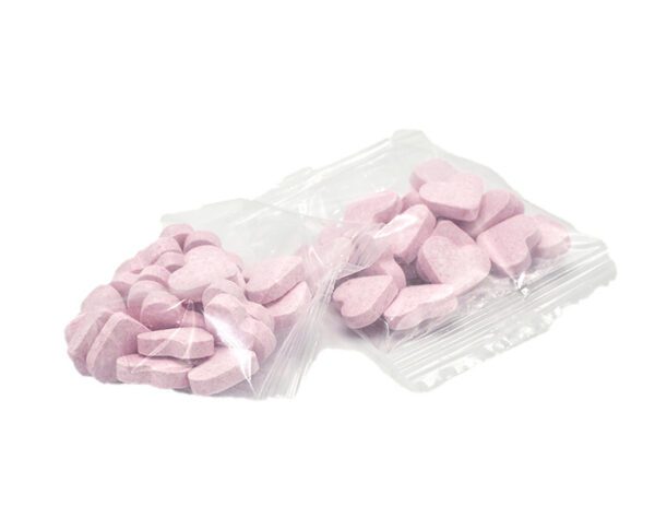Dextrose hartjes in de kleur roos van My First Sweets in een zakje.